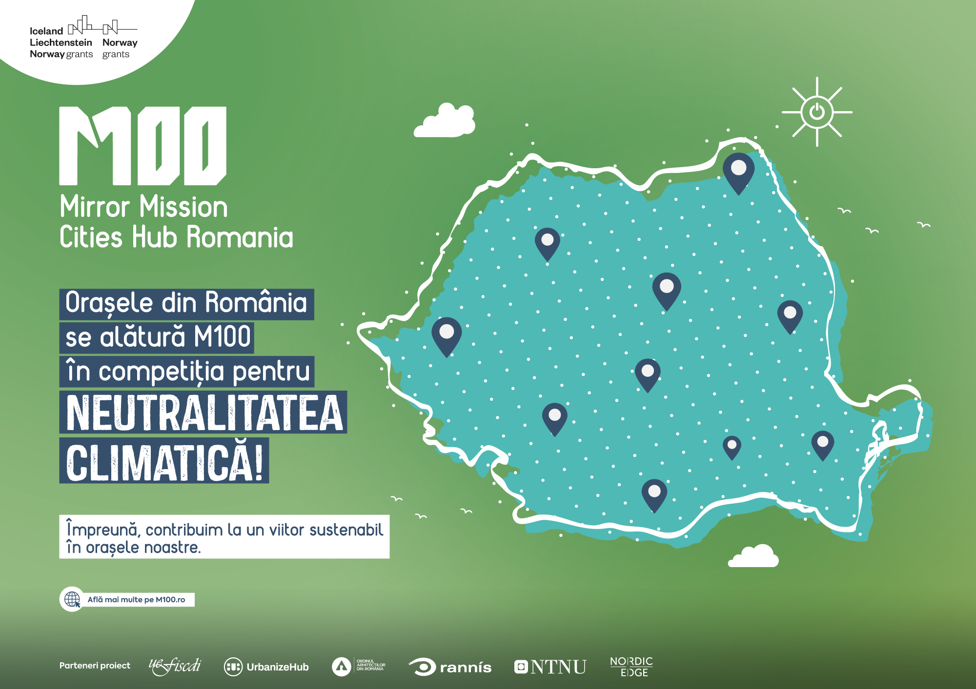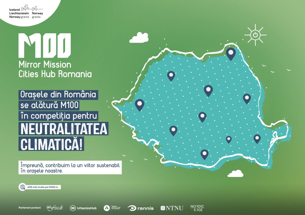 Prin intermediul platformei naționale M100 care coordonează eforturile României pentru a atinge ținte de neutralitate climatică, o misiune oglindă a Misiunii UE „100 de orașe inteligente și neutre din punct de vedere climatic până în anul 2030” și cu sprijinul partenerilor din Norvegia și Islanda, cele 10 orașe din România selectate vor beneficia de informații, activități de dezvoltare a capacității (workshop-uri, webinarii, sesiuni de asistență tehnică individuală) și documentație (ghiduri și modele de documente programatice) pentru elaborarea planurilor de acțiune pentru neutralitate climatică, a planurilor de investiții și a altor documente relevante. Participarea la acest program le va oferi oportunitatea de a genera schimbări pozitive și pe termen lung, de a-și îmbunătăți impactul asupra mediului prin reducerea emisiilor de gaze cu efect de seră până în 2035 și de a-și construi comunități durabile și implicate.