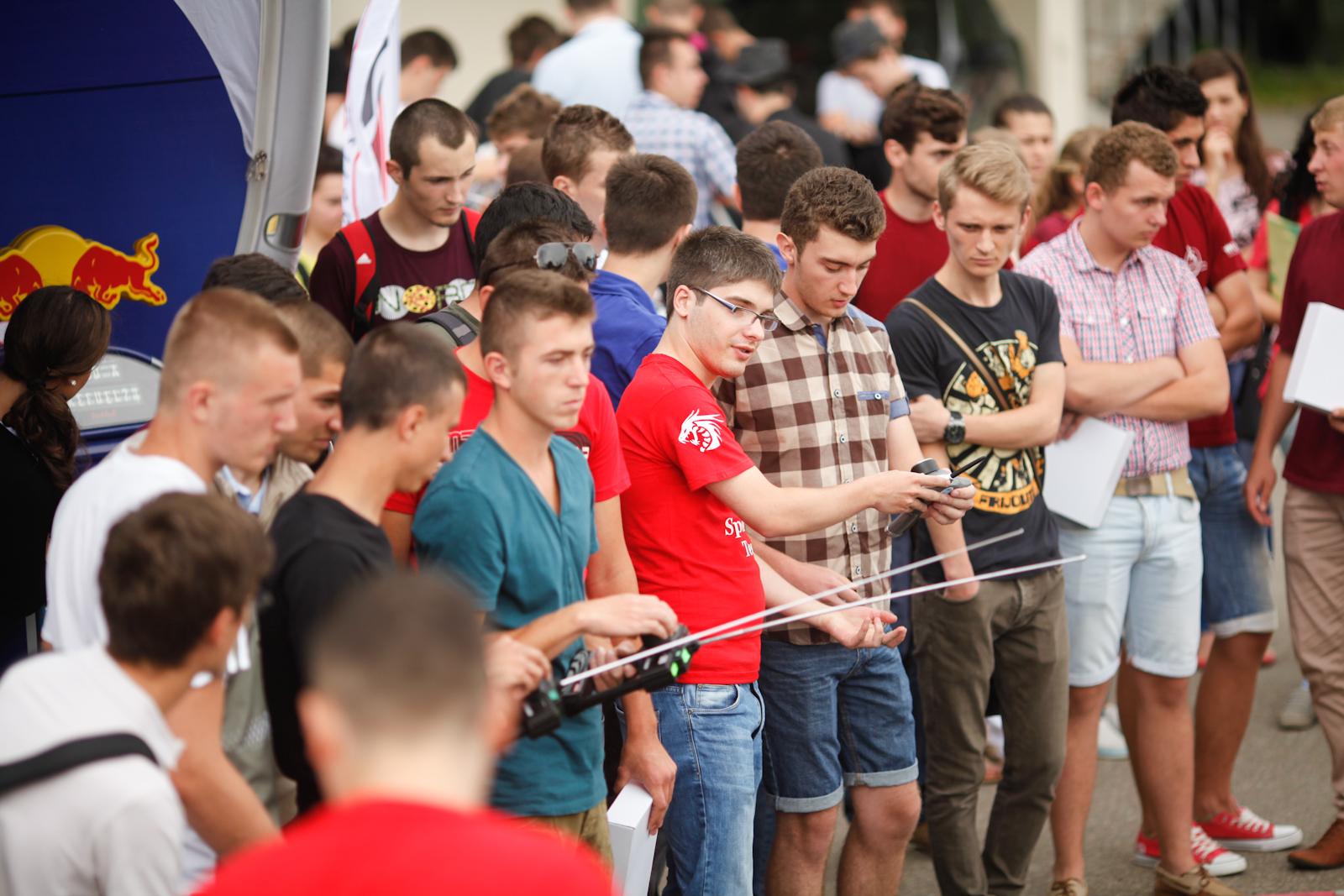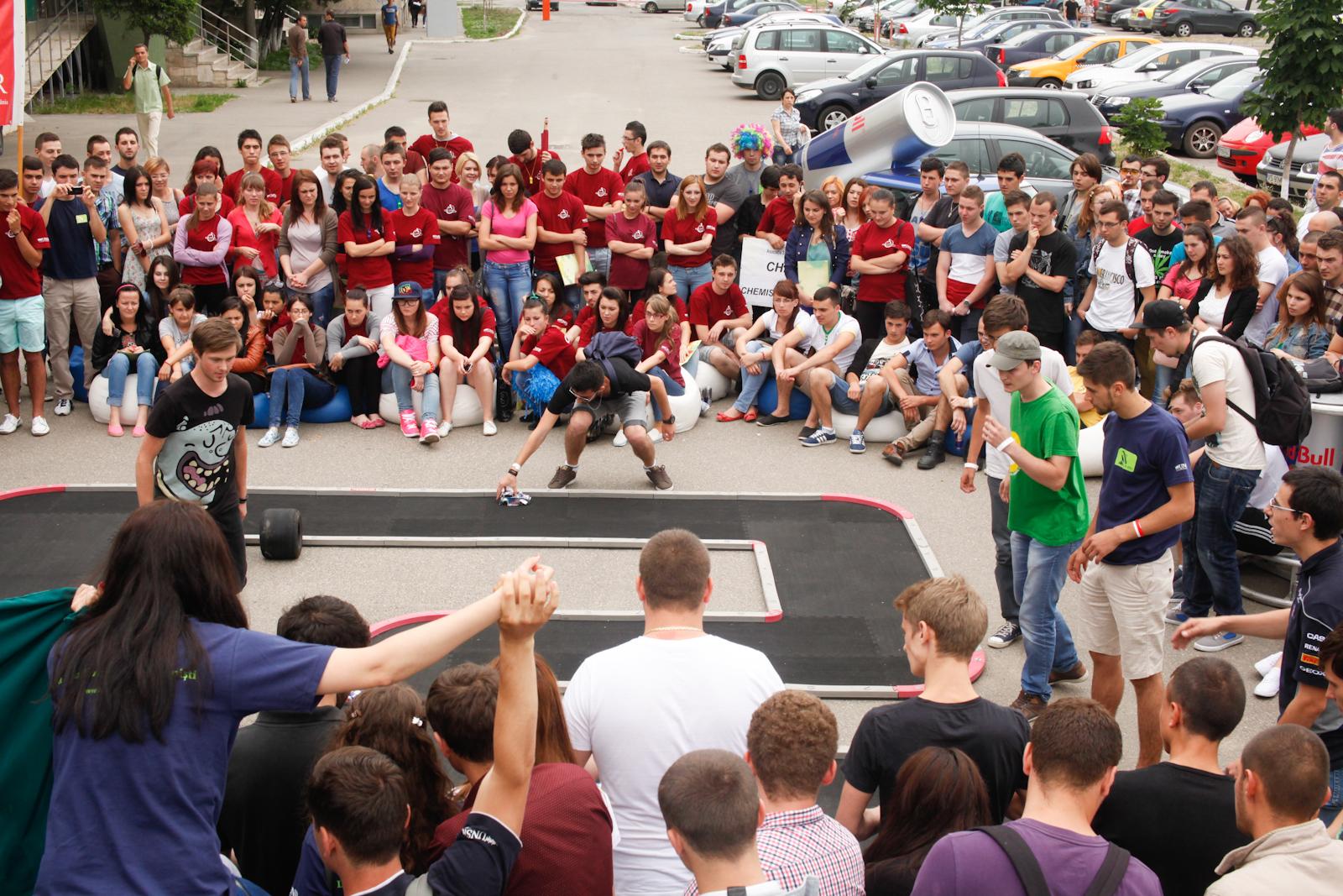 Suspans si emotii la etapa Red Bull Racing Can din Iasi! Studentii ieseni au venit in numar mare sa-si sustina echipele favorite, iar acestea nu i-au dezamagit: depasirile, vitezele atinse si manevrele efectuate de piloti s-au ridicat la inaltimea unei veritabile curse de Formula 1. Sicanele de pe traseu i-au incurcat putin pe studenti, insa toate masinile au trecut cu brio linia de finis. In ciuda ploii, peste 300 de spectatori si-au incurajat favoritii, iar pilotii au fost pusi la grea incercare, trenuind sa concureze cu… pneuri de ploaie.