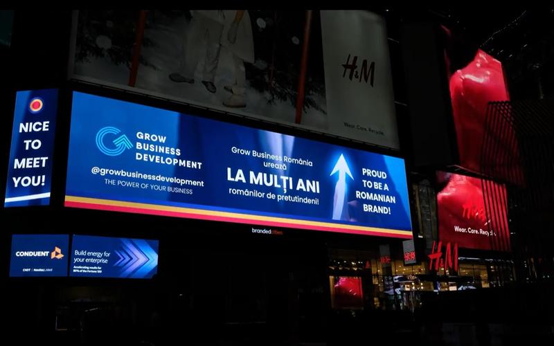 Anca Hreamătă, fondatoarea firmei Grow Business Development din Iaşi, specializată în consultanţă de afaceri, audit operaţional şi financiar, a declarat că a vrut să marcheze Ziua Națională și că a cumpărat spațiul din Times Square pentru două zile.