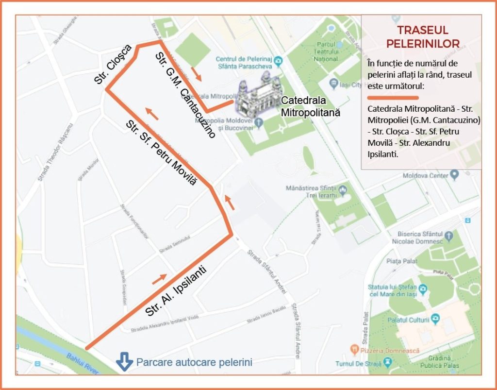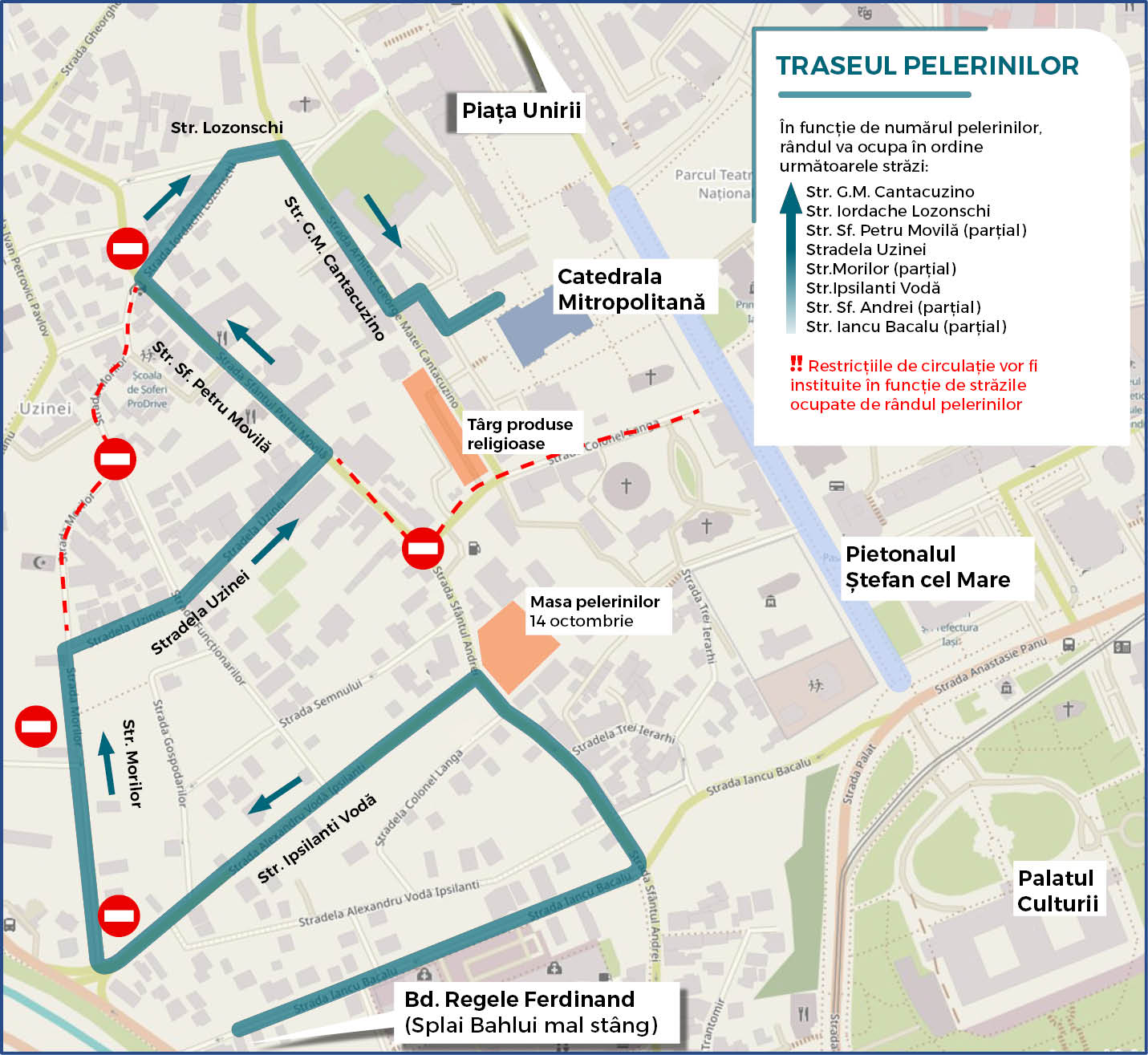 În perioada 8 octombrie 2024, ora 0.00 – 15 octombrie 2024, ora 24.00 se închide, în funcție de necesități, circulația rutieră pe următoarele artere: str. Colonel Langa, str. G. M. Cantacuzino, str. Iordachi Lozonschi – str. Cloșca, str. Sf. Petru Movilă, str. Uzinei, str. Morilor, str. Alexandru Ipsilanti, str. Sf. Andrei, trecătoarea Iancu Bacalu, str. Iancu Bacalu – Traseul pelerinilor.