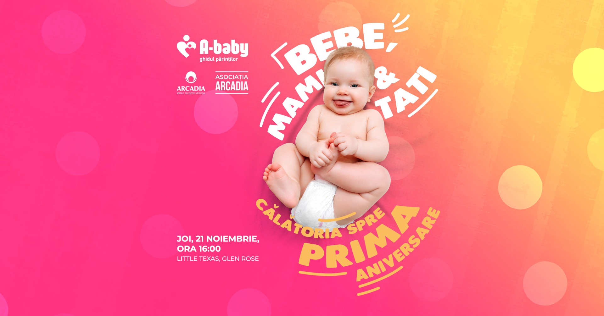 A-Baby. Bebe, mami și tati, călătorie spre prima aniversare. Evenimentul este organizat de catre Arcadia și are loc la Little Texas, joi 21 Noiembrie începând cu ora 16:00.