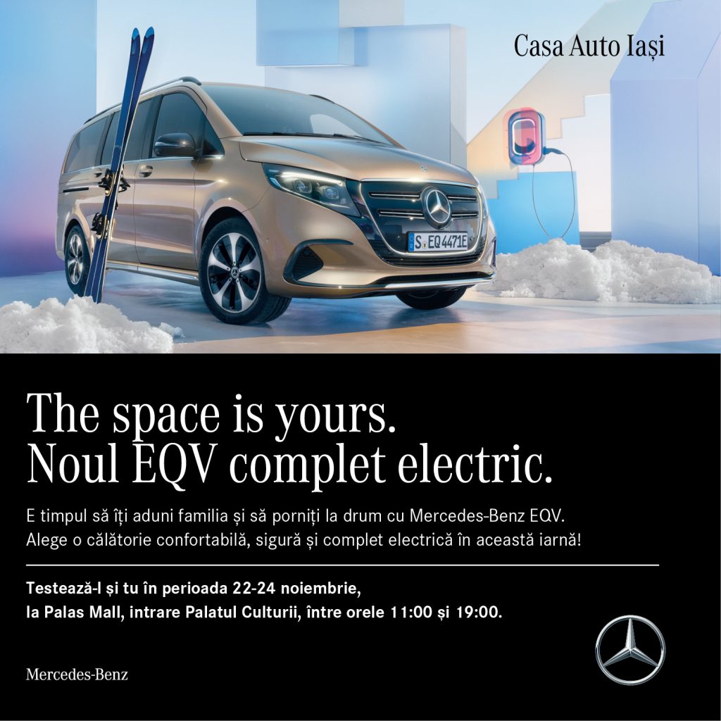 Casa Auto Iași invită toți pasionații de inovație și mobilitate electrică să descopere Mercedes-Benz EQV la Palas Mall Iași, intrare Palatul Culturii, în perioada 22-24 noiembrie, între orele 11 și 19.