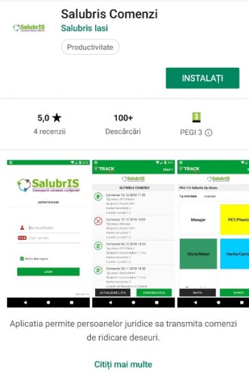 ot ceea ce trebuie să facă beneficiarii este să descarce și să instaleze aplicația de pe Google Play (Magazin Play) și să o activeze cu ajutorului codului de acces. Pentru a putea primi codul de acces este necesar un apel la numărul de telefon 0736.888.690 sau un e-mail la adresa salubris.comenzi@gmail.com, pentru a pune la dispoziția reprezentanților Salubris SA adresa punctului / punctelor de lucru, numele persoanei de contact (administrator), numărul de telefon și adresa de e-mail.