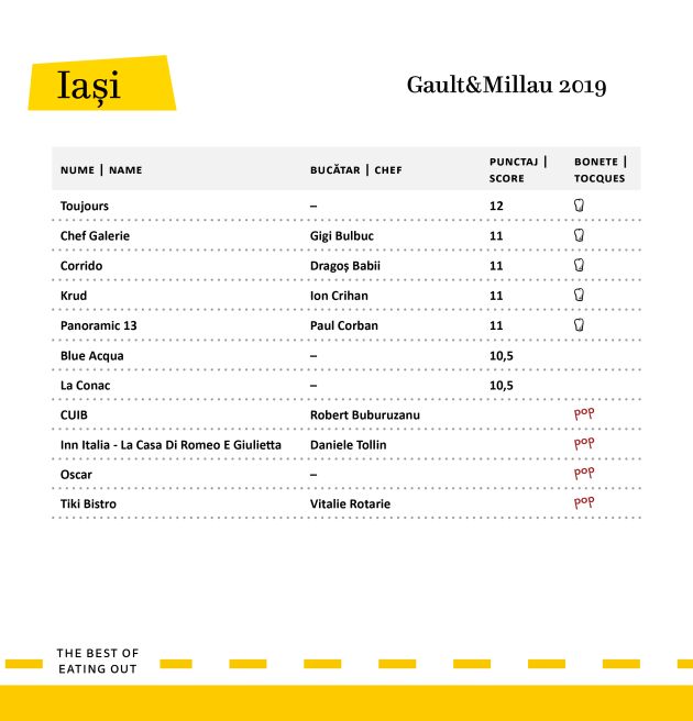 Gault&Millau a lansat ediția 2019 a ghidului de restaurante pentru România. Iașul a fost evaluat pentru prima dată și apare în ghid cu 11 localuri selectate – dintre care 7 restaurante și 4 POP-uri.