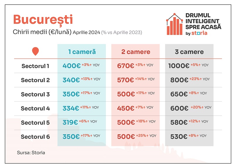 Conform datelor Storia, în luna aprilie apartamentele de închiriat din sectorul 6 au înregistrat cea mai mare creștere de preț comparativ cu anul trecut (+24%), urmate de apartamentele din sectorul 2 (+23%) și de cele din sectoarele 3 și 5 (+16%). Cele mai mici creșteri de preț per sectoare s-au înregistrat în sectorul 1 (+6%) și în sectorul 4 (+12%).