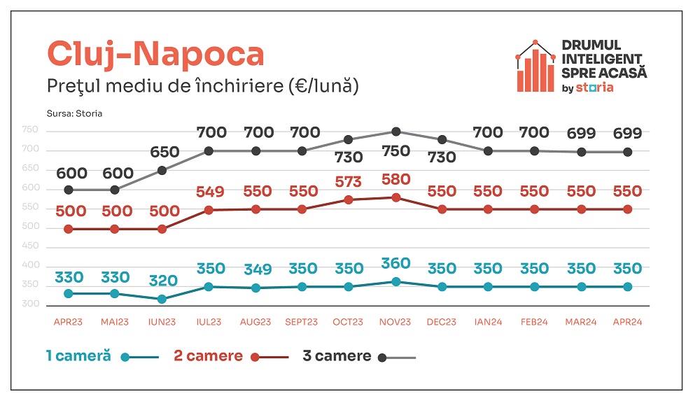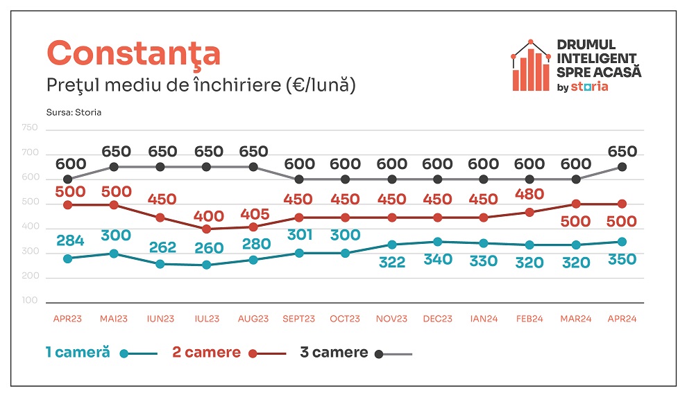 Astfel, în luna aprilie 2024 prețul mediu de închiriere al garsonierelor a fost de 320 de euro, în timp ce apartamentele cu două camere s-au închiriat, în medie, cu 430 de euro, iar apartamentele cu trei camere s-au închiriat cu un preț mediu de 500 euro.