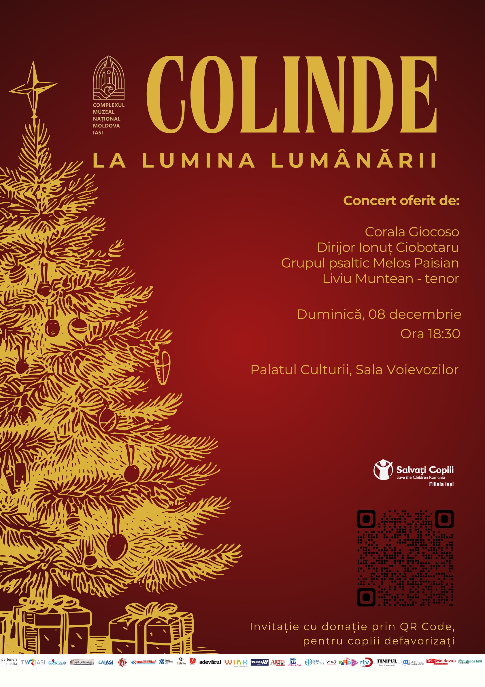 Complexul Muzeal Național „Moldova” Iași, în parteneriat cu Asociația Salvați Copiii Iași invită publicul să participe la cea de-a II-a ediție a concertului caritabil „Colinde la lumina lumânării”, care va avea loc duminică, 8 decembrie 2024, de la ora 18.30, în Sala Voievozilor de la Palatul Culturii.