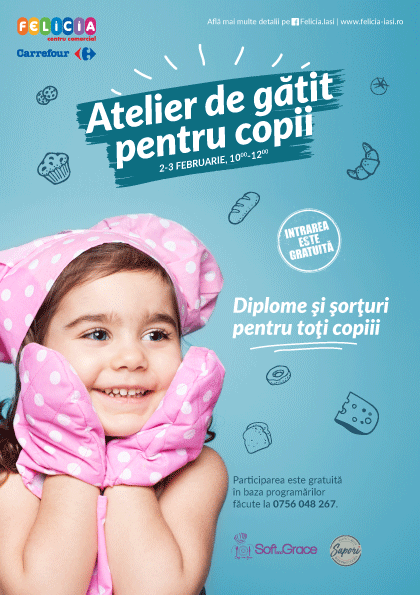 Sâmbătă și duminică, 2 și 3 februarie, orele 10:00 – 12:00, la Centrul Comercial Felicia, are loc atelierul de gătit pentru copii, pe culoarul din mijloc, în zona magazinului Takko. Bucătarii de la Soft & Grace vor învăța copii să gătească un mic dejun sănătos și cel mai gustos sandwich, pentru o gustare sățioasă.