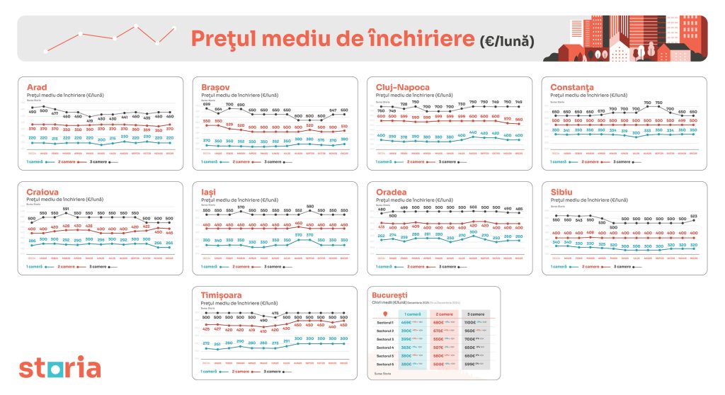 Luna decembrie 2025 a adus ajustări moderate pe piața chiriilor din marile orașe ale țării, potrivit analizei realizate de Storia – cea mai vizitată platformă imobiliară din România. Evoluțiile diferă de la un oraș la altul: în aproximativ jumătate dintre orașele analizate, prețurile medii ale chiriilor s-au menținut la același nivel sau au fost mai mici comparativ cu decembrie 2024, în timp ce în sudul și vestul țării au fost înregistrate creșteri punctuale. În decembrie 2025 comparativ cu decembrie 2024, Constanța și Iași sunt singurele orașe în care chiriile au rămas neschimbate la toate cele trei categorii de apartamente, în timp ce Craiova a consemnat cel mai mare avans anual, de +11% pentru chiria apartamentelor cu două camere, iar Timișoara a înregistrat creșteri de +10% pentru garsoniere și de +6% pentru apartamentele cu două camere.
