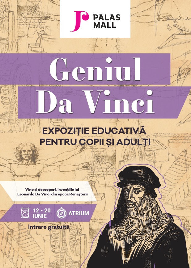 Ieșenii și nu numai, pot descoperi la Palas o parte din invențiile și arta lui Leonardo da Vinci și pot surprinde o secvență din felul în care funcționează o minte strălucită. Expoziția educativă pentru copii și adulți este localizată în Atriumul Palas Mall, iar în perioada 12 – 20 iunie 2021 vizitatorii vor putea admira replici ale unor mașinării de zbor, hidraulice și de război, dar și echipamente de construcții, care respectă fidel schițele și proiectele genialului inventator.