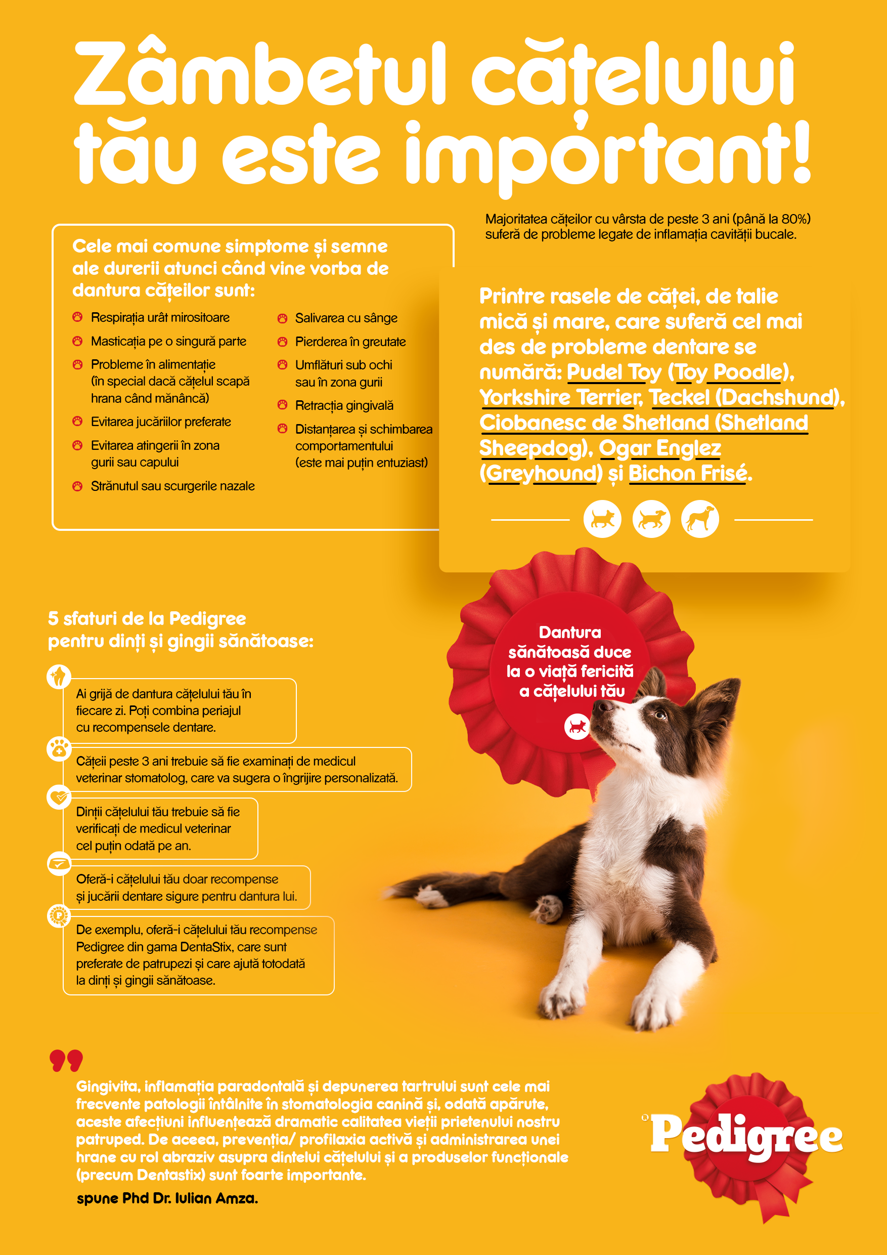 „Gingivita, inflamația paradontală și depunerea tartrului sunt fără îndoială cele mai frecvente patologii din stomatologia canină. Stăpânul cățelului este primul responsabil în prevenirea și profilaxia afecțiunilor cavității orale și, tocmai de aceea, examinarea frecventă a gurii cățelului trebuie să fie un lucru firesc și chiar plăcut acestuia. Recomand consultul oral al cățeilor ori de câte ori este nevoie și nu numai deoarece de sănătatea orală a cățelului depinde confortul general al acestuia, iar prevenția este mai facilă și mai puțin costisitoare decât tratamentul stomatologic.” a completat Phd Dr. Iulian Amza, Petcare Ambasador în cadrul Mars Multisales Europe.