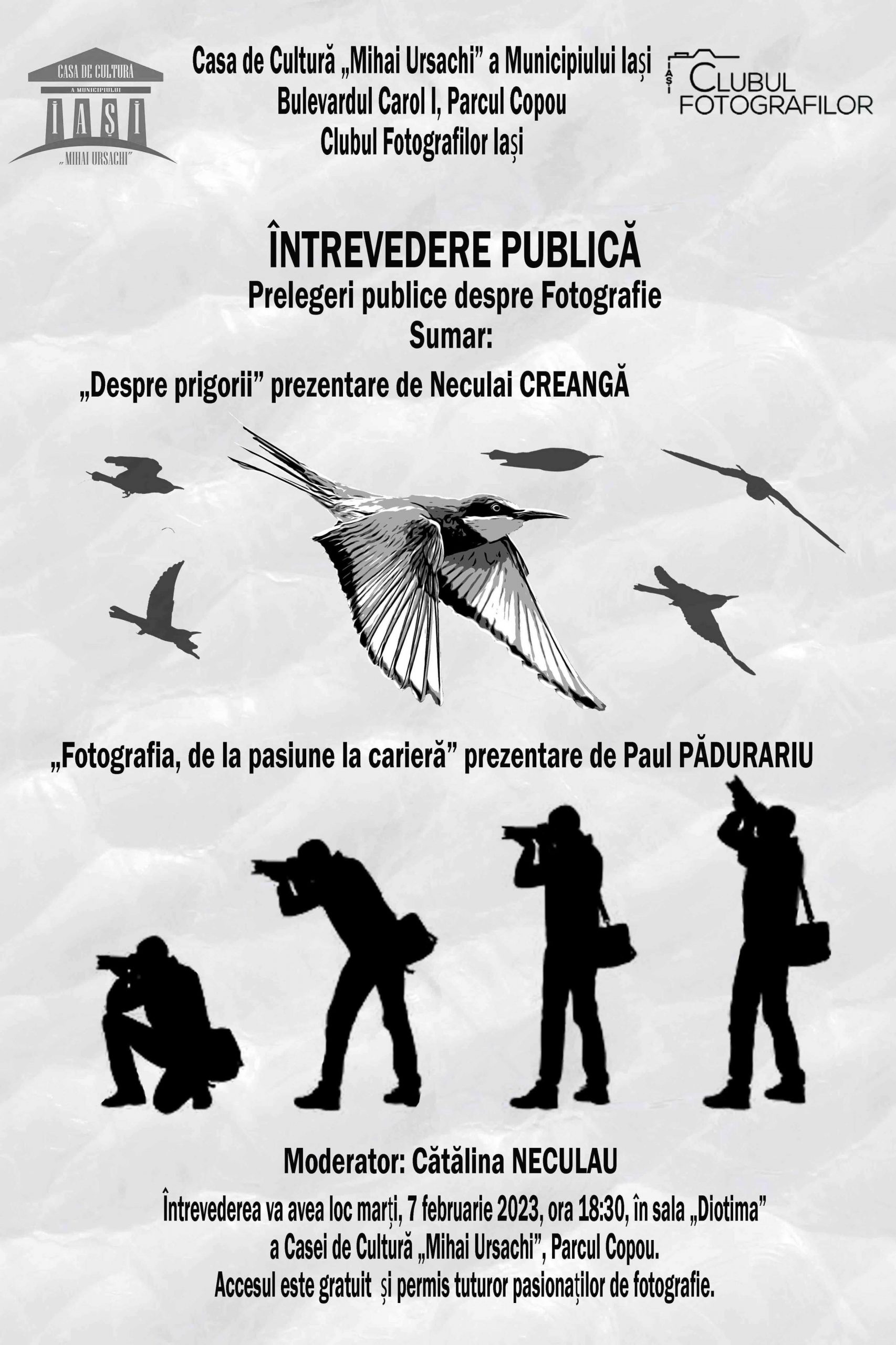 Clubul Fotografilor Iași, organizează pe data de 7 februarie 2023 o nouă întrevedere publică ce se va desfășura la Casa de Cultură Mihai Ursachi, în Sala Diotima începând cu ora 18:30.