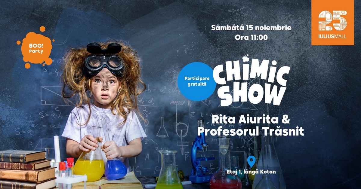 Sâmbătă, de la ora 11:00, la etajul 1, în zona Koton, distracția vine la pachet cu un spectacol exploziv de știință. Rita Aiurita și Profesorul Trăsnit revin la Iulius Mall Iași cu un Chimic Show impresionant, marca BOO Party. Experimente colorate îi așteaptă pe copii să fie mici cercetători pentru o zi.