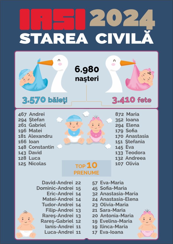 Potrivit Direcției Locale de Evidență a Persoanelor, în anul 2024 în Municipiul Iași au fost înregistrate 6.980 de nașteri, din care 3.570 băieți și 3.410 fete.