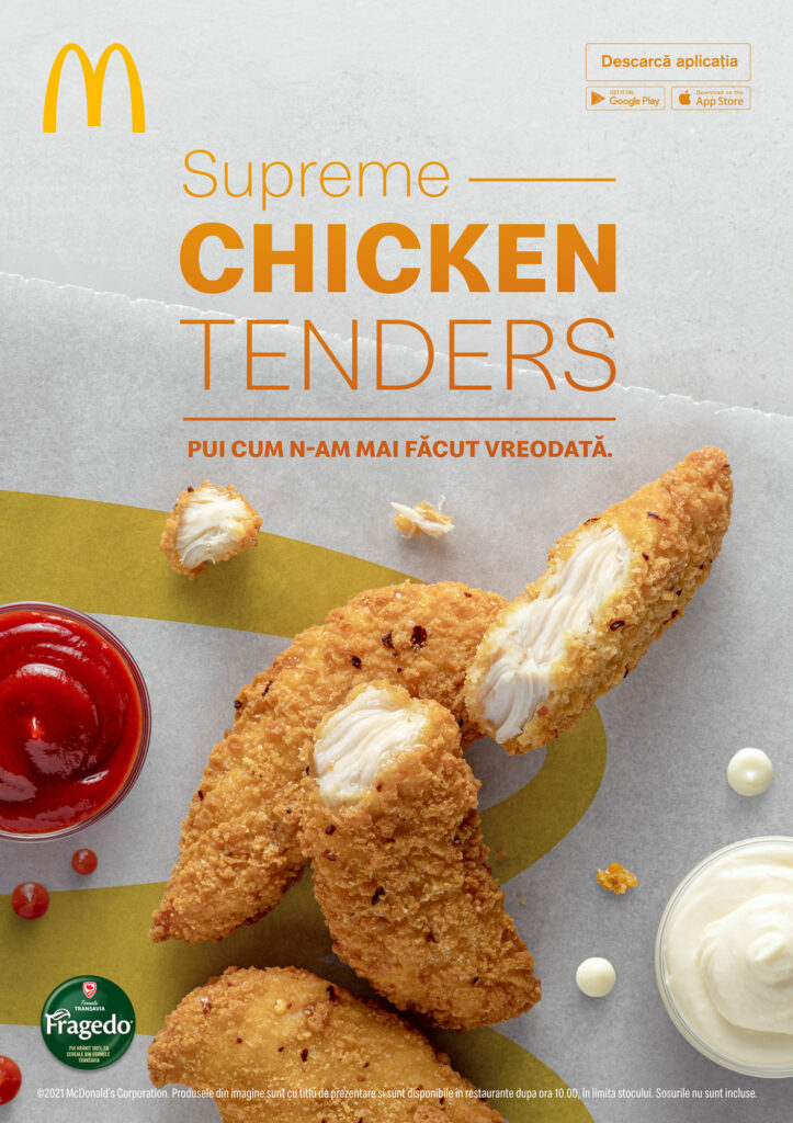 Noile Supreme Chicken Tenders sunt disponibile în toate restaurantele McDonald’s din țară, inclusiv la McDrive sau prin McDelivery, începând cu data de 25 iunie 2021. O porție de Supreme Chicken Tenders este formată din trei bucăți generoase de carne de pui, iar consumatorii pot comanda o porție sau o pot include într-un meniu, alături de o băutură răcoritoare la alegere și de cartofi prăjiți.
