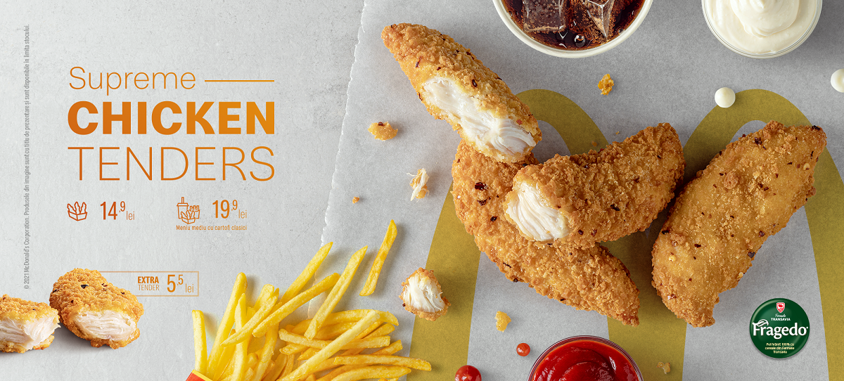 McDonald’s lansează pentru prima dată în România Supreme Chicken Tenders, după o rețetă dezvoltată alături de Transavia, cel mai mare producător de carne de pui de pe plan local. Noile Supreme Chicken Tenders conțin trei bucăți generoase și gustoase de piept de pui fraged, învelite într-un strat fin de pesmet crocant și condimentate cu fulgi de ardei iute. Produsele sunt disponibile în toate restaurantele McDonald’s din țară începând de astăzi, 25 iunie.