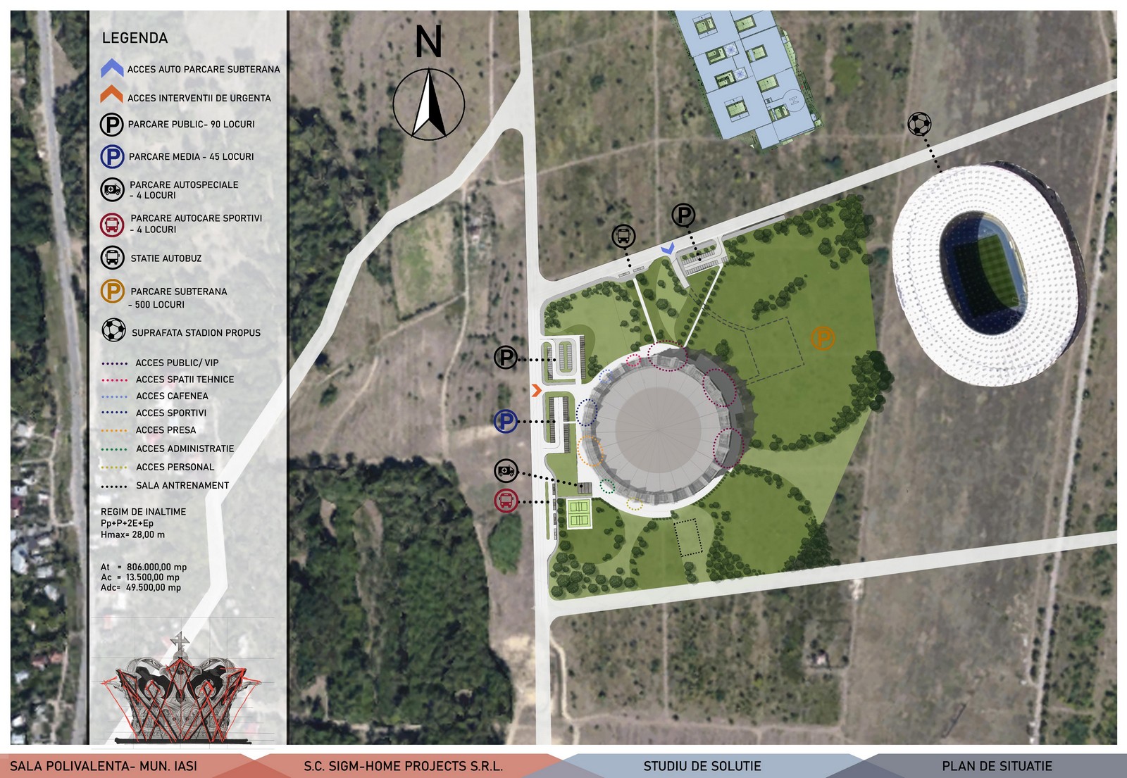 Clădirea noului imobil va prelua rolul de principală facilitate pentru competiții și spectacole în Municipiul Iași și în zona periurbană a acestuia. De asemenea, sala va fi folosită în permanență ca bază de antrenament pentru sportivi (handbal, baschet, volei etc.). Astfel, zonele funcționale de bază ale clădirii vor consta în: sală pentru competiții și spectacole, spații pentru sportivi și oficialii meciurilor, spații pentru presă și alte spații conexe pentru public.