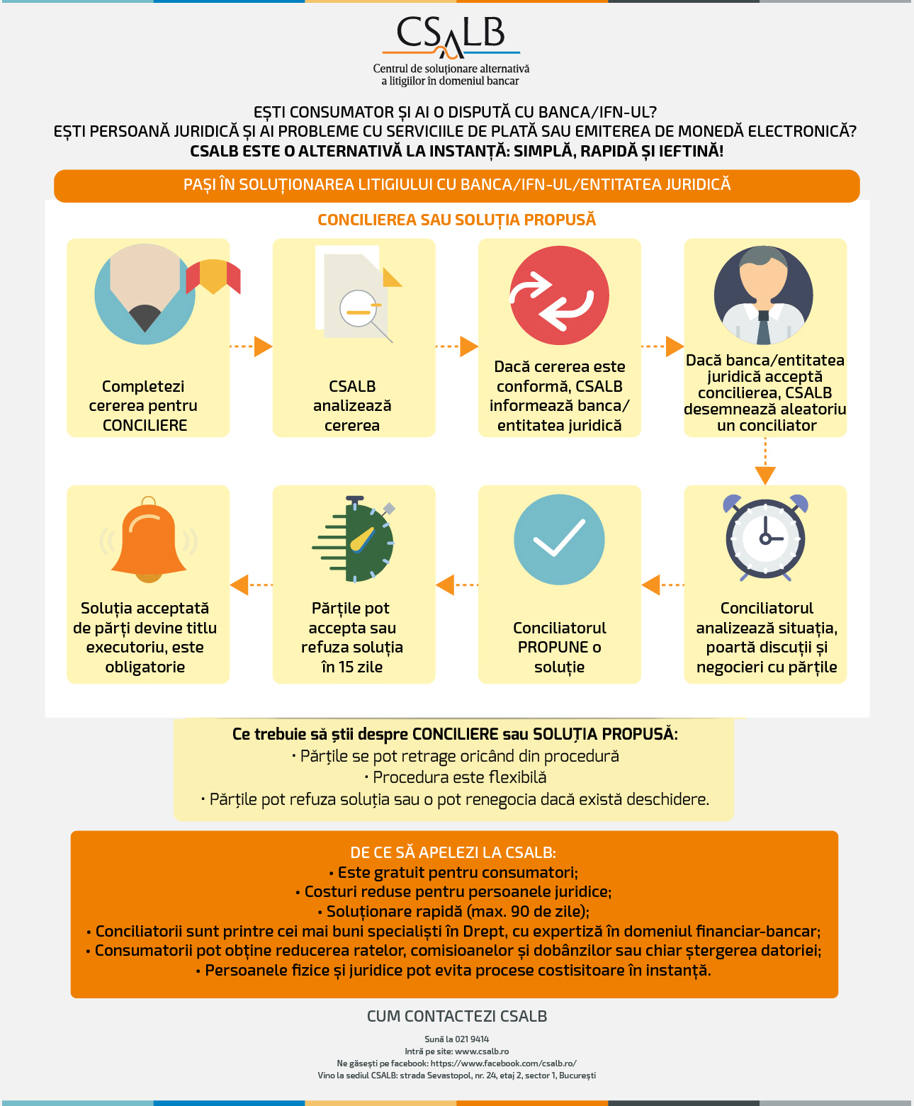 CSALB este o entitate înființată ca urmare a unei Directive europene și intermediază gratuit și în mai puțin de trei luni negocierea dintre consumatori și bănci sau IFN-uri pentru contractele aflate în derulare. Consumatorii din orice județ al țării pot trimite cereri către Centrul de Soluționare Alternativă a Litigiilor în domeniul Bancar (CSALB) prin aplicația online aflată pe site-ul www.csalb.ro. Dacă banca acceptă intrarea în procedură de conciliere este desemnat un conciliator. CSALB colaborează cu 19 conciliatori, dintre cei mai buni specialiști în Drept, cu expertiză în domeniul financiar-bancar. Totul se rezolvă amiabil, iar înțelegerea părților are puterea unei hotărâri în instanță. Mai multe informații despre activitatea Centrului puteți obține și la telefon 021 9414 (apel cu tarif normal).