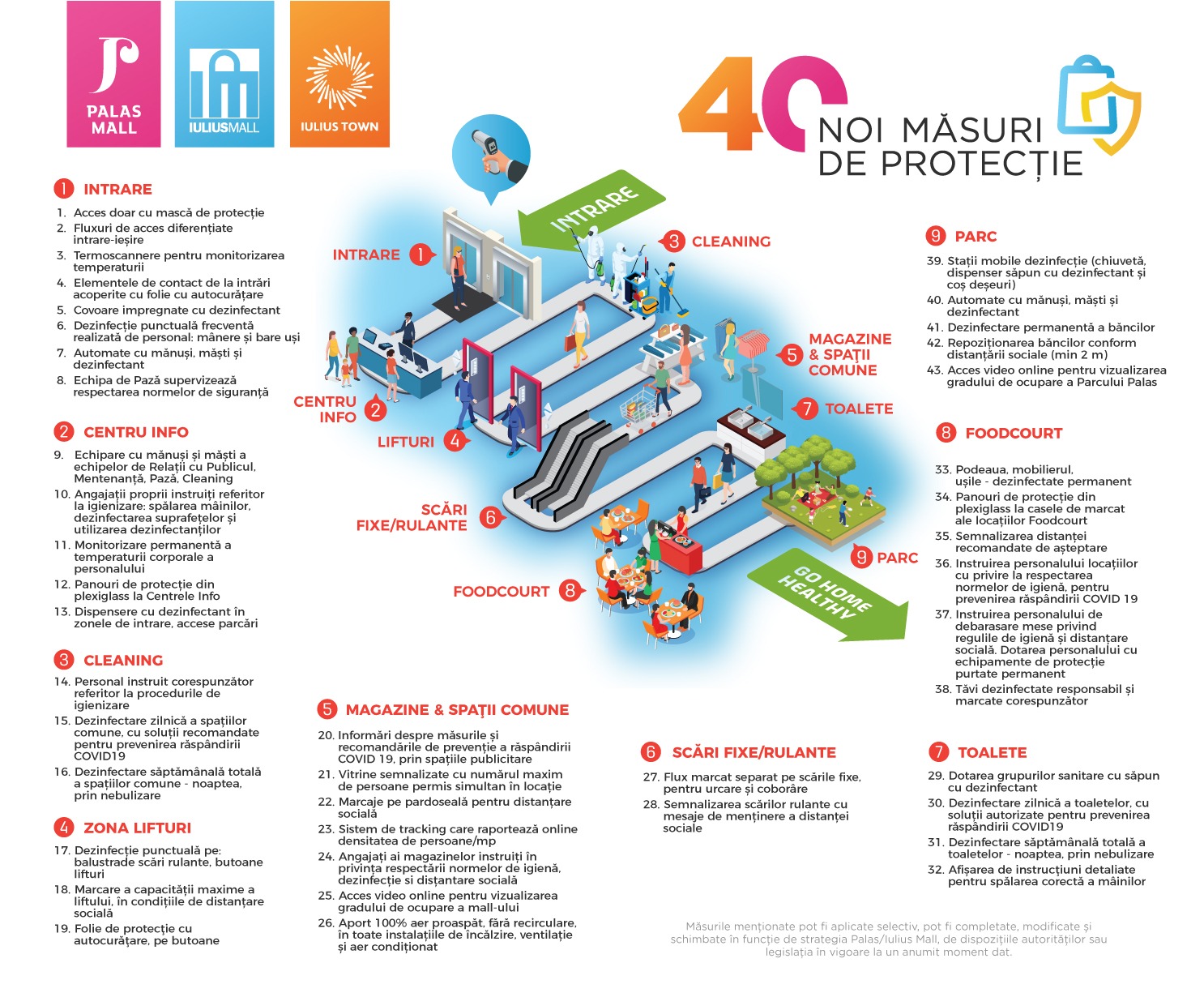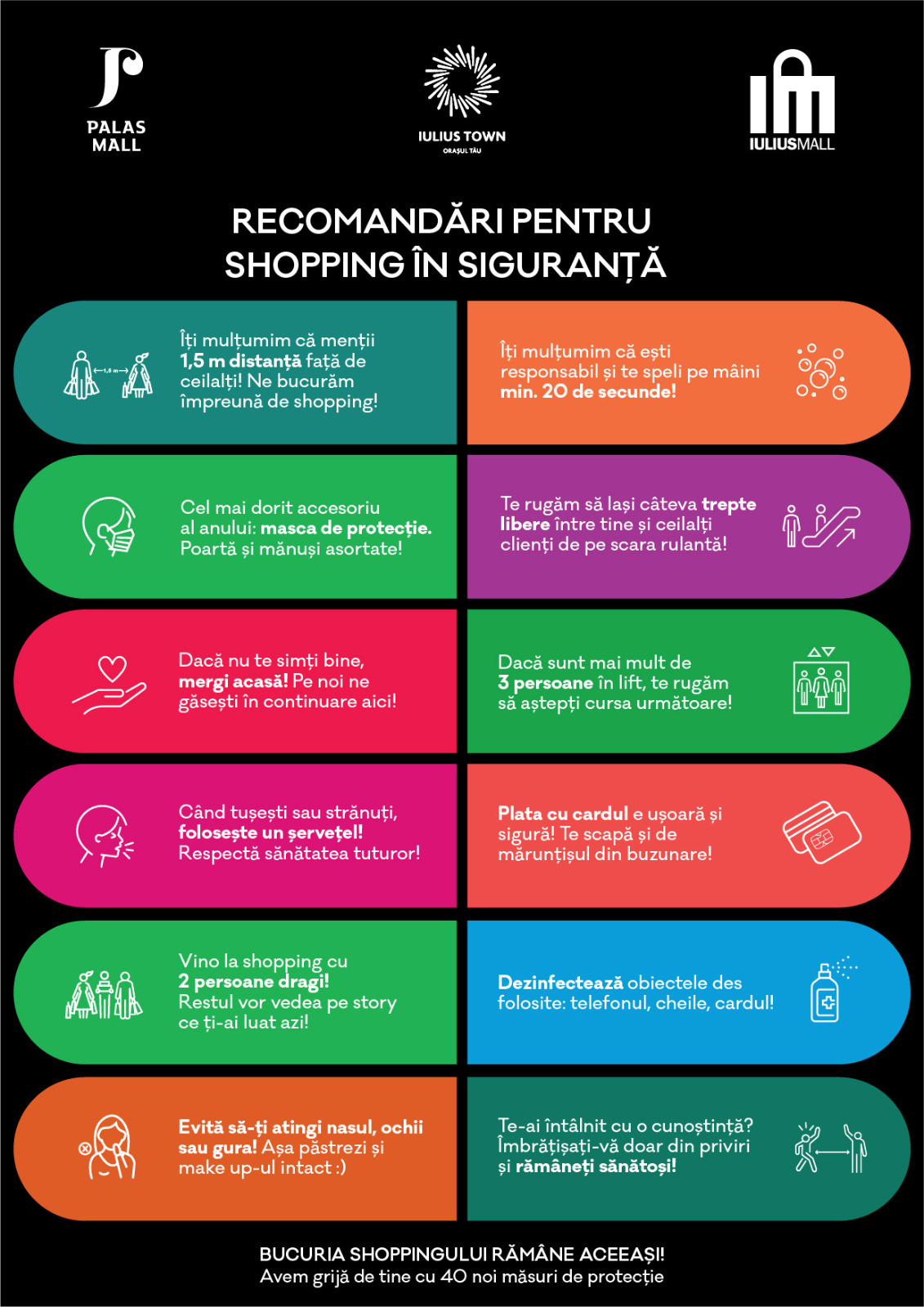 Contextul este altul, iar siguranța este prioritatea noastră, a tuturor! Ne-am pregătit pentru momentul reîntâlnirii cu un pachet complex și complet de acțiuni de prevenire și măsuri de distanțare fizică. Astfel, fluxurile de intrare/ieșire sunt reorganizate diferențiat, la intrare sunt termoscannere pentru monitorizarea temperaturii, covoare profesionale impregnate cu substanțe active, dispensere cu dezinfectant și personal instruit pentru a monitoriza respectarea normelor de siguranță. Accesul în incinta Palas Mall și Iulius Mall Iași se face doar cu purtarea măștii de protecție, iar la intrări sunt amplasate automate de vânzare cu mănuși, măști și dezinfectant.