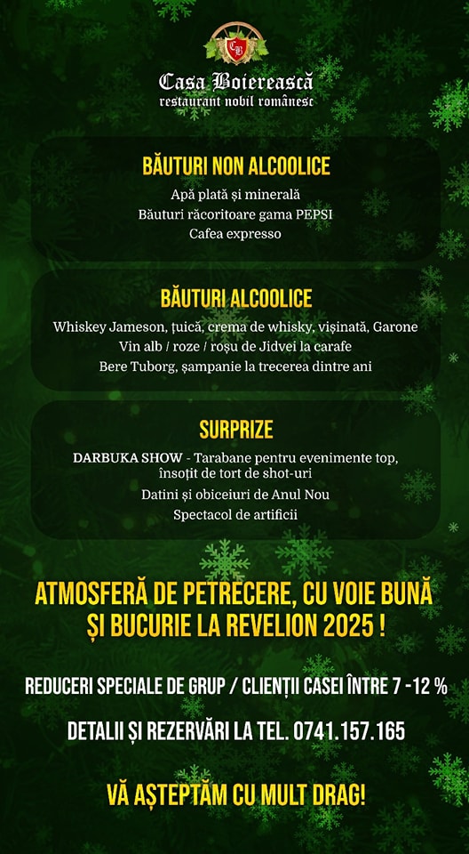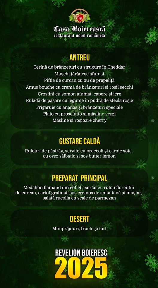 Casa Boiereasca poate fi gazda perfecta pentru dvs, venind în întâmpinare cu un meniu rafinat,excelent, atent gândit pe masura așteptărilor !