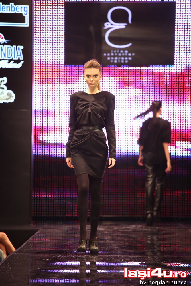 Alina Ene a incercat sa imbine eleganta cu tehnologia, showul designerului bazandu-se foarte mult pe luminile din sala, aceasta fiind o idee incercata pentru prima data intr-un festival de moda din Romania.