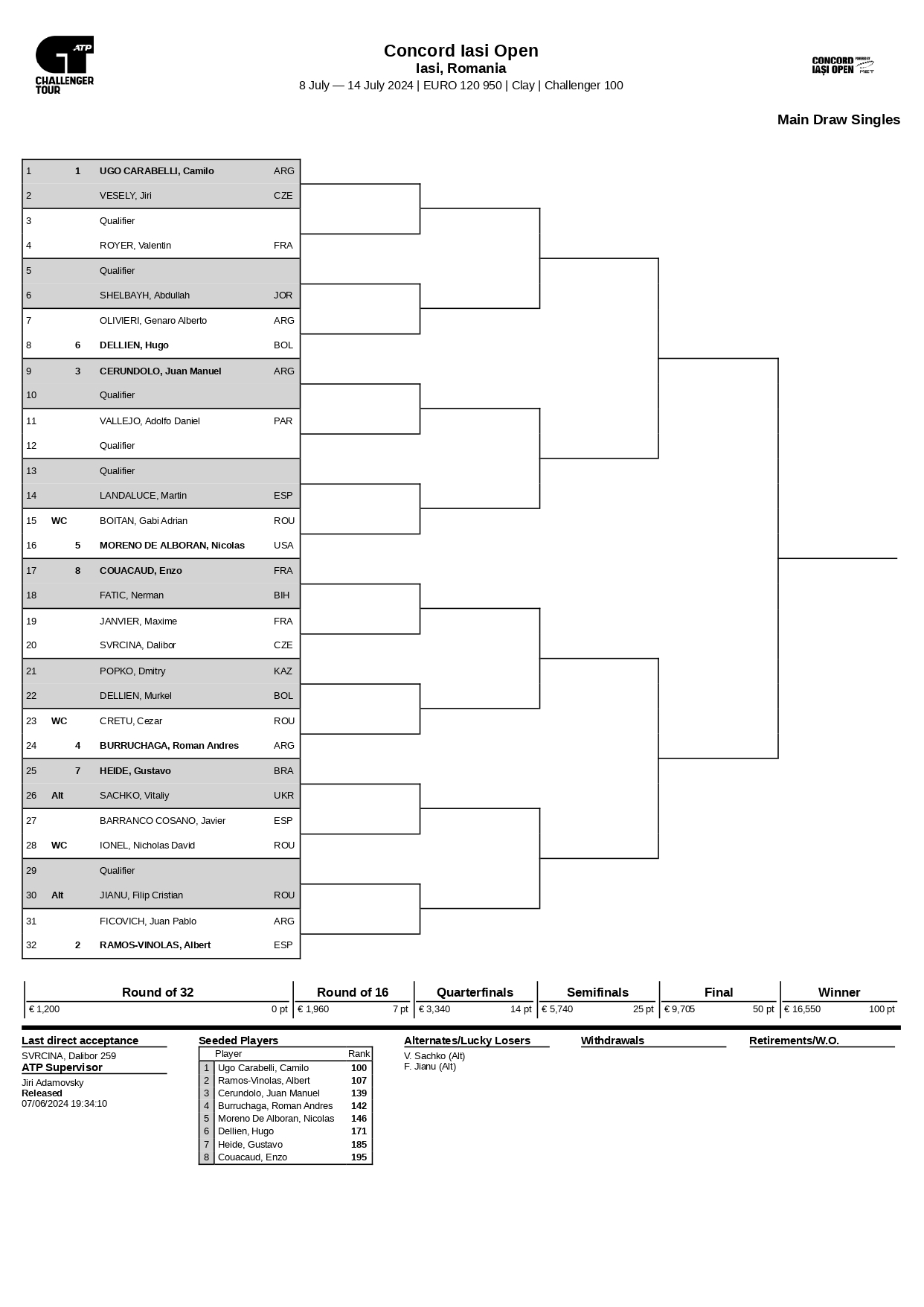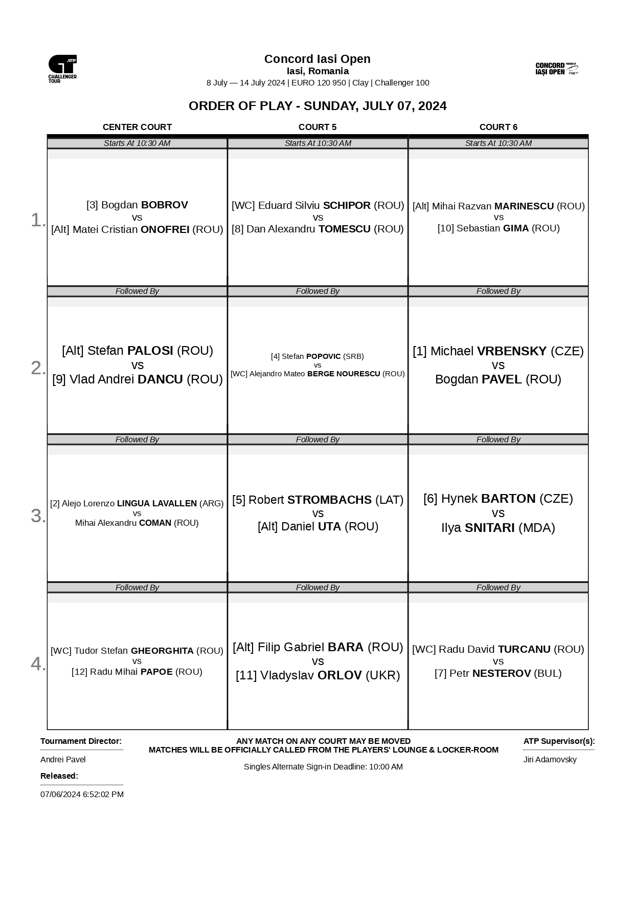 Sâmbătă seară a avut loc tragerea la sorți a tabloului principal la turneul ATP Challenger 100 Concord Iași Open – Powered by MET. Evenimentul a fost coordonat de supervizorul ATP Jiri Adamovsky, acesta fiind ajutat de directorul de turneu Andrei Pavel, jucătorul Matei Onofrei și Andrei Oriță, deținătorul licențelor Iași Open.