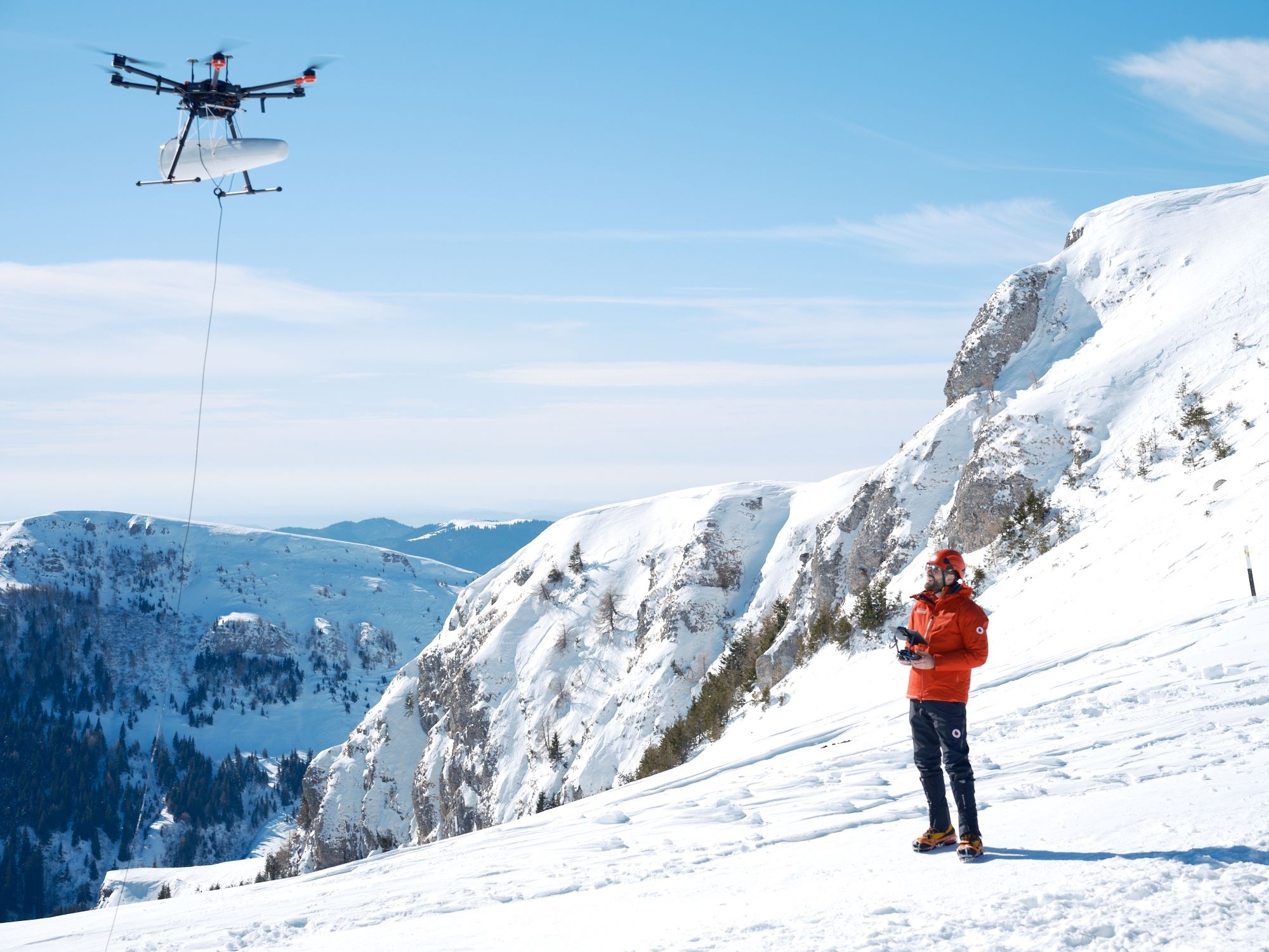 Prima dintre soluții este dezvoltată în premieră de echipa de tehnologie a Vodafone România și asigură acoperirea cu semnal mobil în zonele montane greu accesibile şi înconjurate de pereţi stâncoşi care blochează propagarea semnalului mobil generat de releele terestre actuale. Soluția este formată dintr-un echipament instalat la sol, pe un mijloc de transport specific acestor zone, care se conectează prin satelit la centrul rețelei Vodafone, şi un echipament radio instalat pe o dronă profesională ce este ridicată deasupra zonelor de căutare. Echipamentul radio instalat pe dronă generează semnalul mobil (voce și date), inclusiv semnal 5G, pe o rază de până la 10 km. Telefonul mobil al persoanei căutate se conectează, astfel, în mod automat la rețeaua Vodafone, victima putând contacta serviciul unic de urgenţă 112, indiferent de operatorul ale cărui servicii le folosește. Mai mult, dacă persoana căutată utilizează aplicația Salvamont-Vodafone și a activat funcția de localizare prin date mobile înainte de a porni pe traseu, echipa de salvatori montani va putea urmări traseul acesteia pe munte și o va putea găsi mai repede.