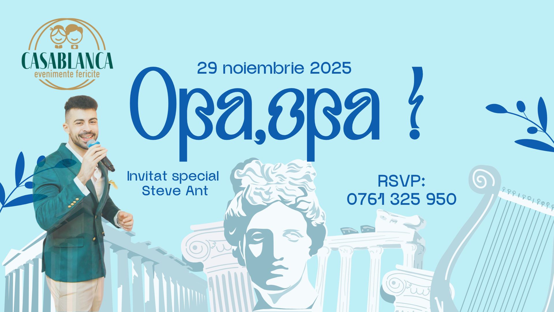 Opa,Opa! Briza marii si veselia elena vine direct la restaurant Casablanca din Iasi in data de 29 noiembrie 2025 incepand cu orele 19.00. O seara plina de dans si veselie alaturi de ansamblul artistic Orpheas a Comunitatii Elene din Iasi pe acordurile muzicii grecesti autentice mixate de Dj Cristian Sava, iar pentru o petrecere 100% ne-am gandit sa invitam un artist 100% autentic elen, binecunosctul cantaret . Vocea sa dulce si ritmurile binecunoscute grecesti va vor transpune in dulcea Grecie, iar totul va fi incununat de o masa imbelsugata cu produse autentic grecesti dirijate de si echipa sa,licori magice servite de mixologii nostri.
