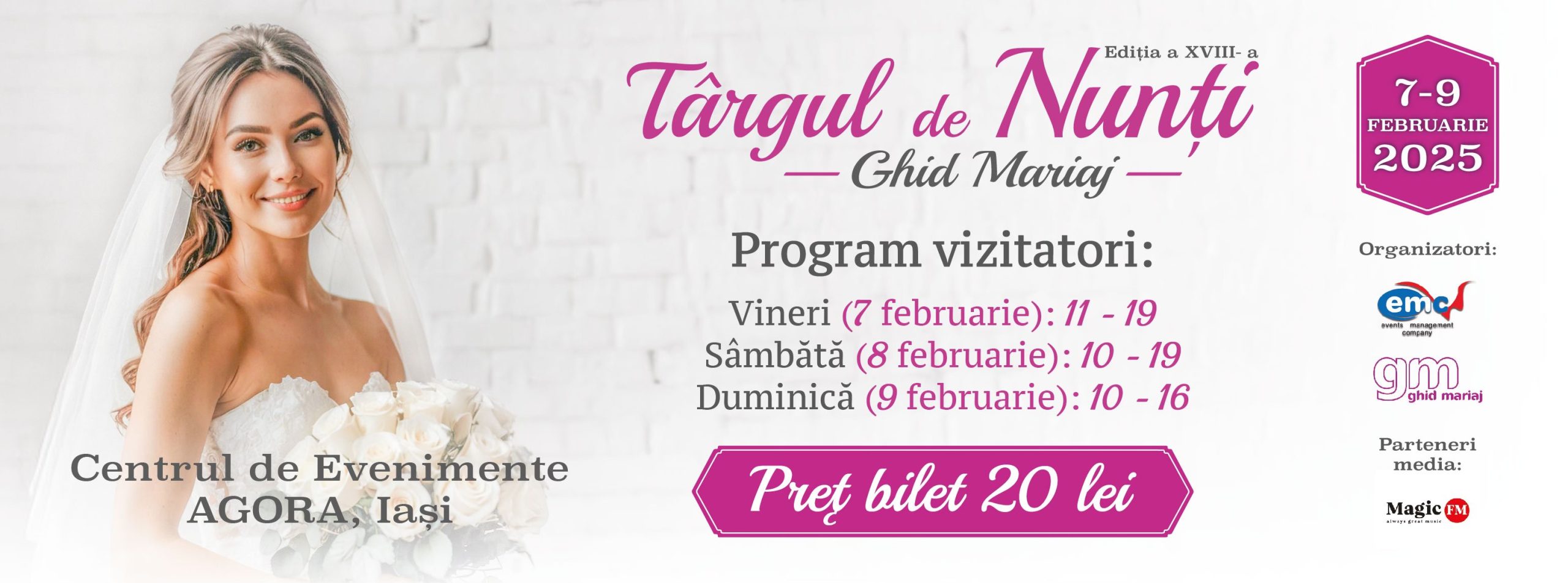 Nu lăsa stresul organizării nunții să-ți strice buna-dispoziție și starea de visare! Vino la Târgul de Nunți GHID MARIAJ în perioada 7-9 februarie 2025 și lasă profesioniștii să dea contur nunții la care visezi!