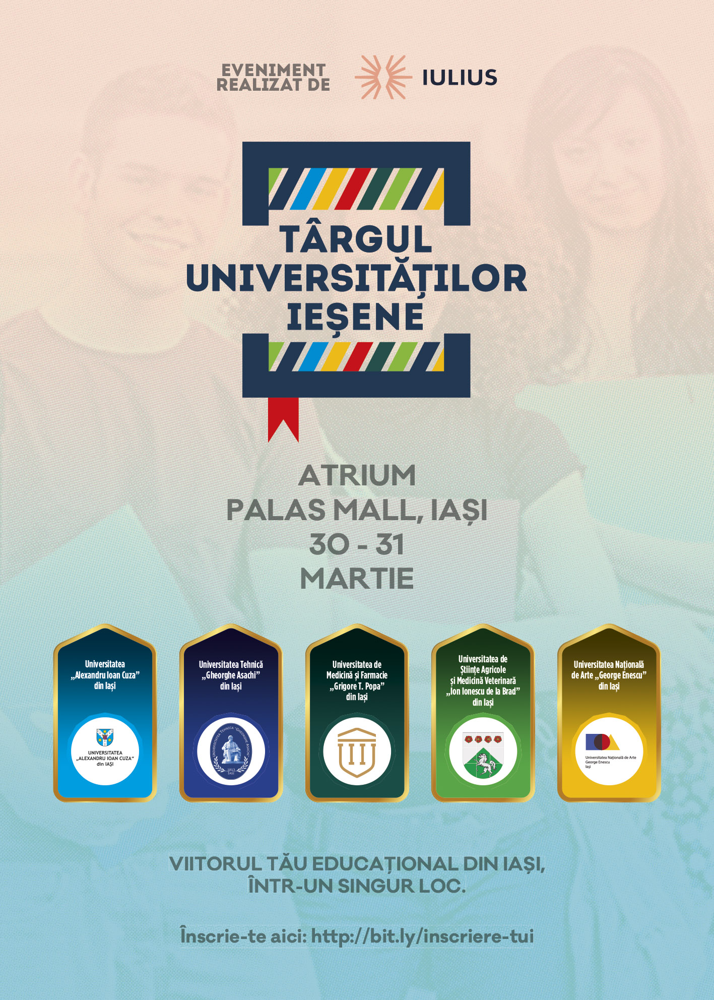 Cele cinci universități de stat din Iași își prezintă oferta educațională simultan, în cadrul unui târg organizat de compania IULIUS, pe 30 și 31 martie 2019. Liceenii sunt așteptați în ansamblul Palas Iași, să se orienteze cu privire la facultatea pe care o vor urma.