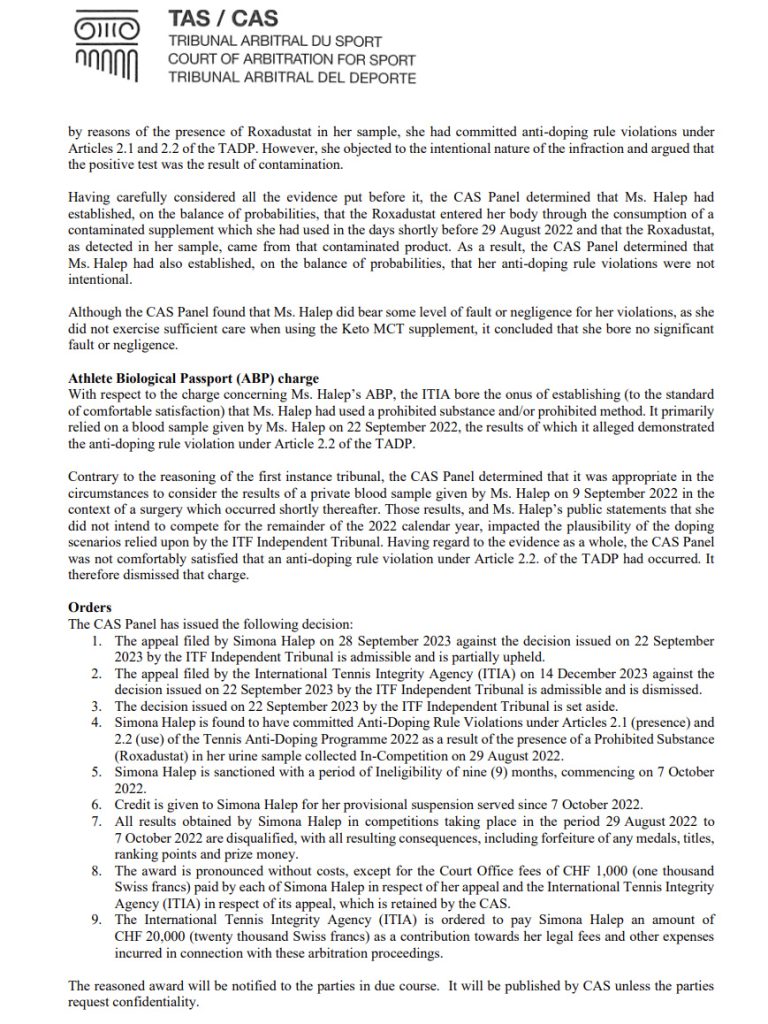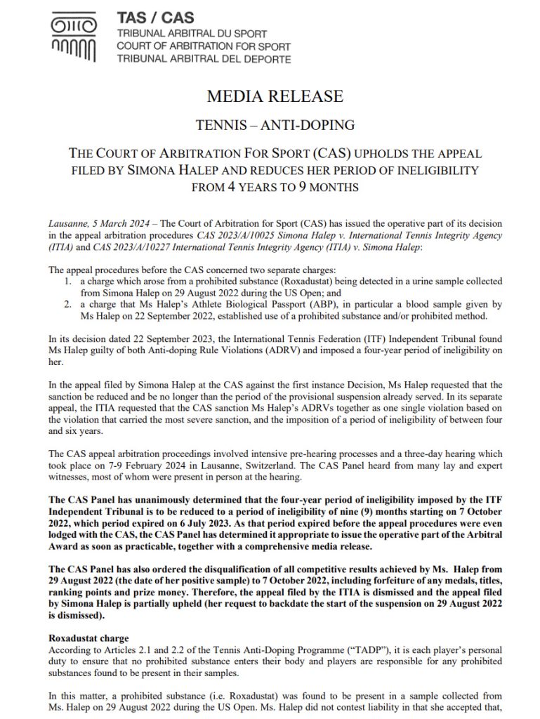 Simona Halep (34 de ani) a primit o veste URIAȘĂ: TAS i-a redus pedeapsa la 9 luni, după audierile care au avut loc în perioada 7-9 februarie 2024. TAS a publicat OFICIAL decizia, decizie ce o puteti vedea mai jos, ea fiind preluata de pe canalele oficiale de comunicare a TAS.