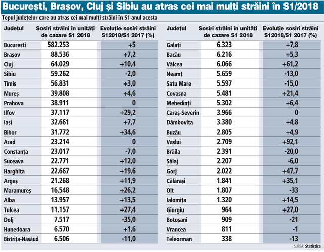 Conform unui studiu realizat de catre Ziarul Financiar, aproape un sfer din vizitatorii straini s-au cazat in Brasov,Cluj, Sibiu si Timis, la coada clasamentului se afla Giurgiu, Vrancea, Botosani si Teleorman.